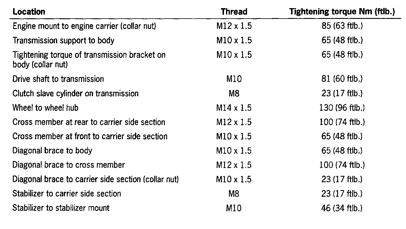 Tightening torque of engine mount to engine carrier: 85 Nm (63 ft. lbs.)