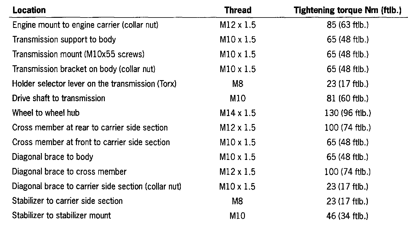 Tightening torque of transmission bracket on body: 65 Nm (48 ft. lbs.)