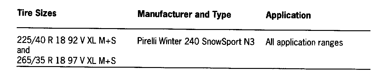 If new tires are to be mounted or the tires of one axle are to be replaced, tires of the same make, the same type and with the same specification code must always be used on each of the two axles. If tires are replaced on one axle only, the different tread depth from that on the other axle can cause a noticeable change in the familiar handling. This is especially the case if new tires are mounted on the rear axle. This effect decreases with increasing tire mileage.