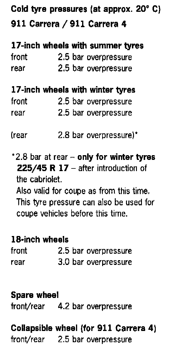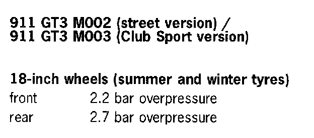 The stated air pressures are minimum pressures and must never be fallen below, since in addition to the unfavorable driving performance, this would bring about a risk of serious tire damage.