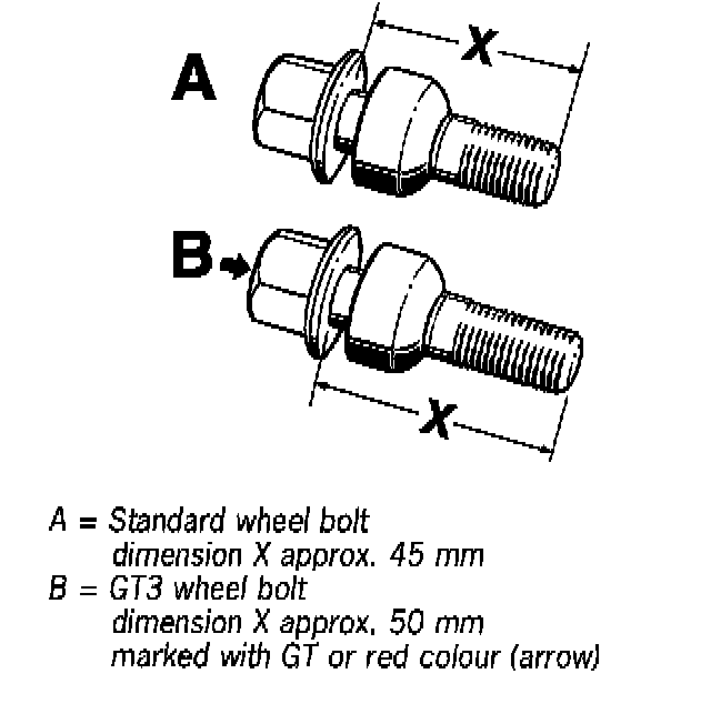 Note: There are 5 mm spacer washers (identical parts) fitted to the front and rear axles on the 911 GT3. The wheel bolts are 5 mm longer because of the spacer washers. The longer wheel bolts are marked with GT or with a red color (arrow) on the face surface of the bolt head. The color of the spherical cap is also red from now on.