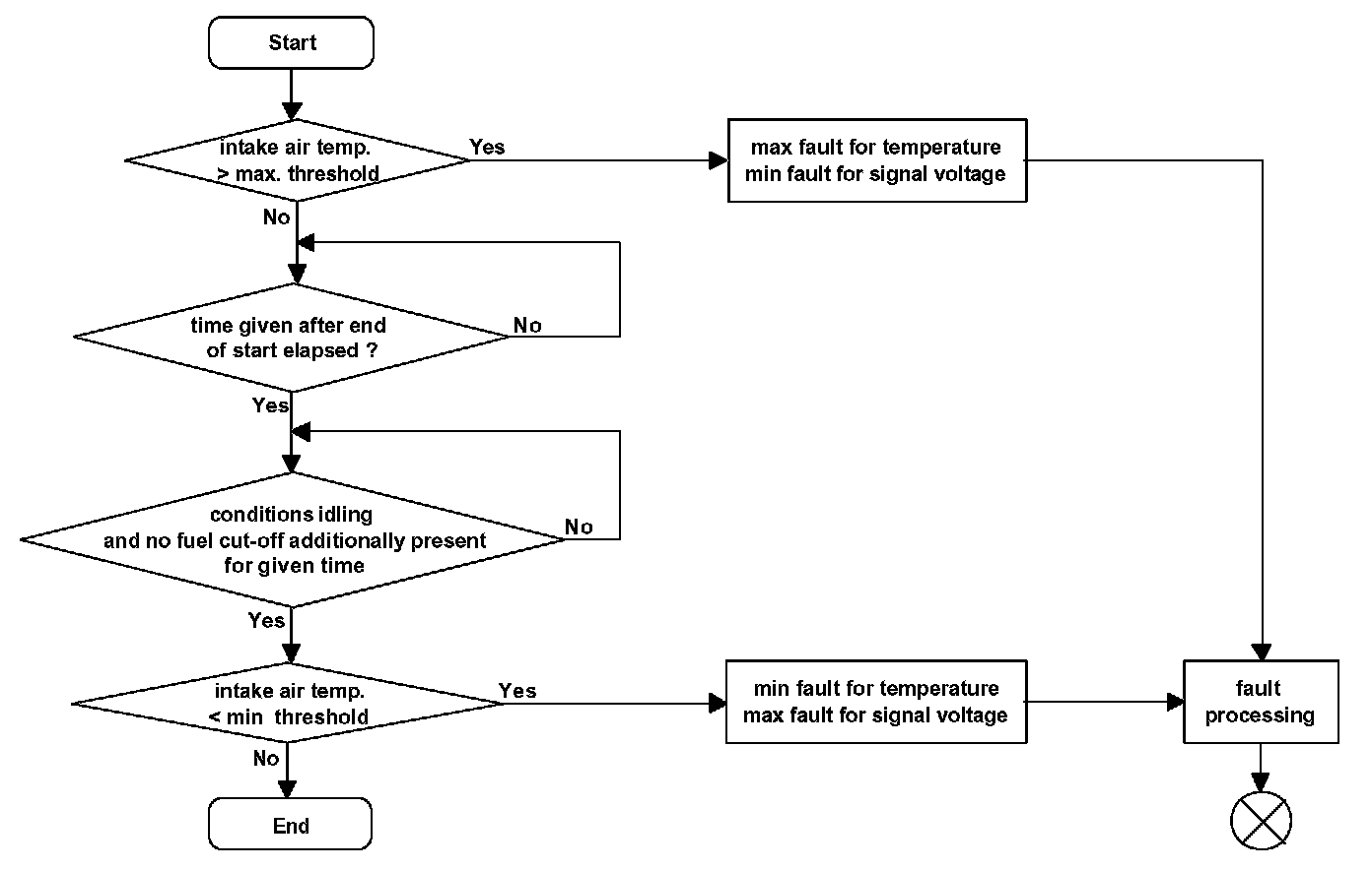 In order to detect a faulty temperature sensor signal below the plausible operation limit, additional conditions (e.g. time delay after end-of-start has elapsed, minimum idling time without fuel cutoff) have to be met in order to determine that a working sensor would have to output a higher value, as a result of heat soak from the engine. Otherwise, when below this threshold, a sensor signal fault is detected (see Diagnose of Intake Air Temperature Sensor).
