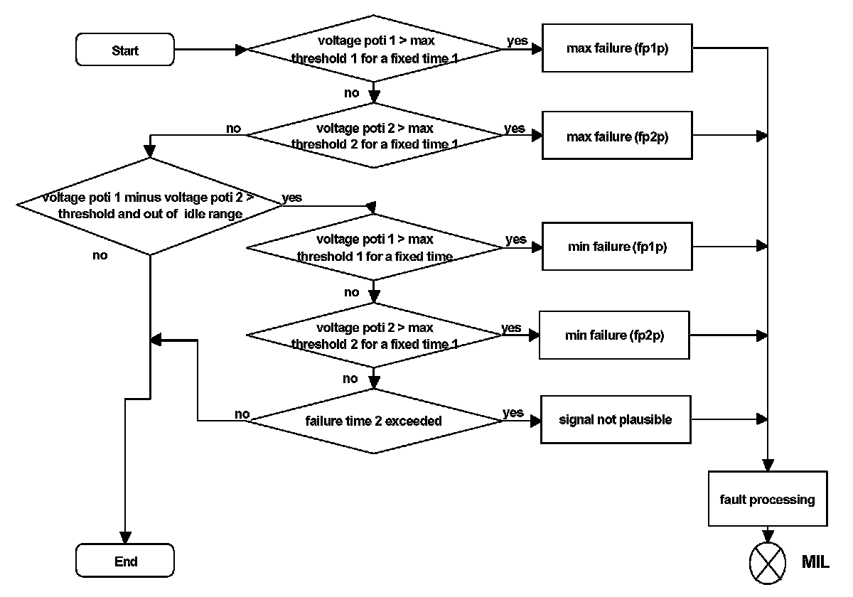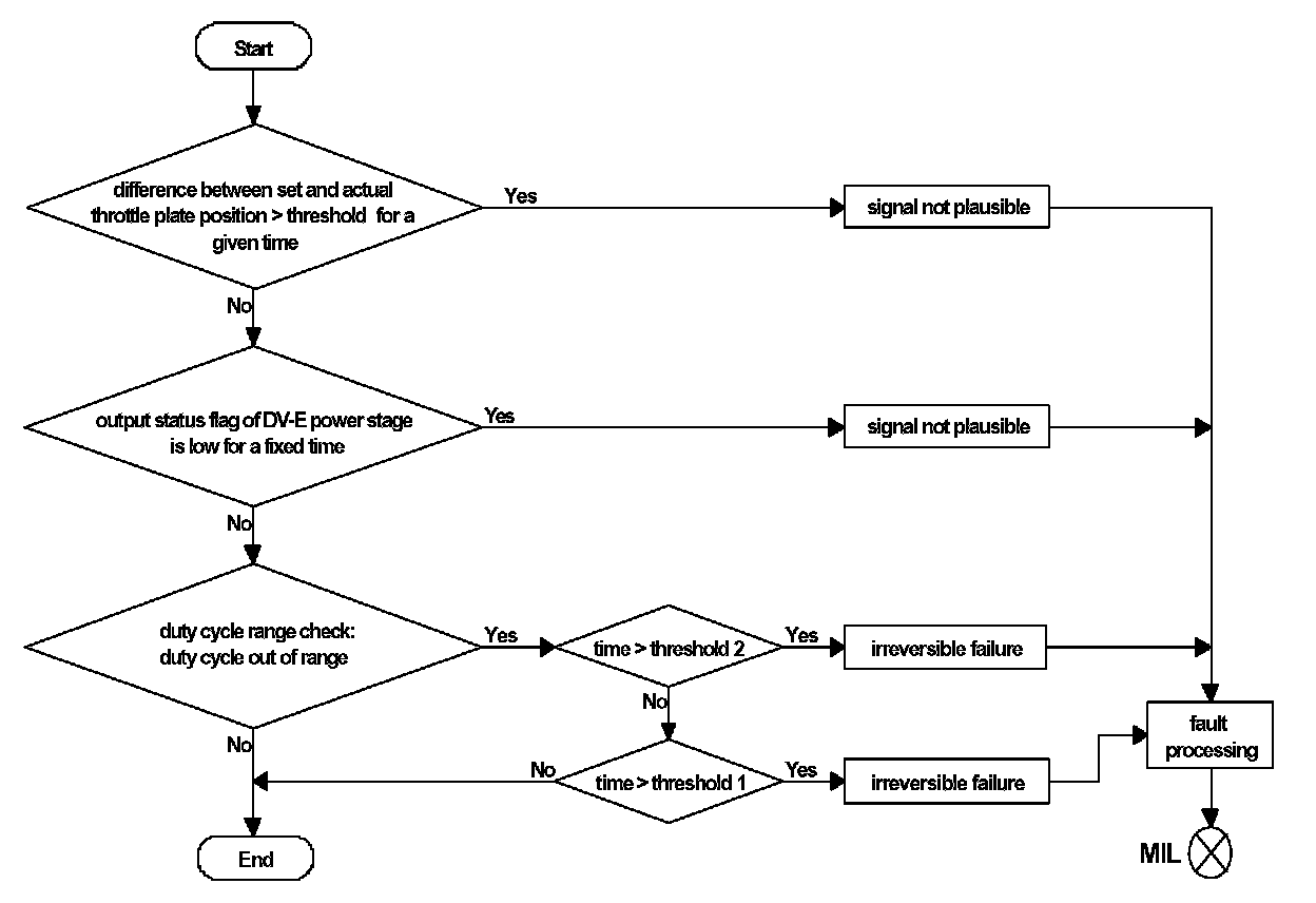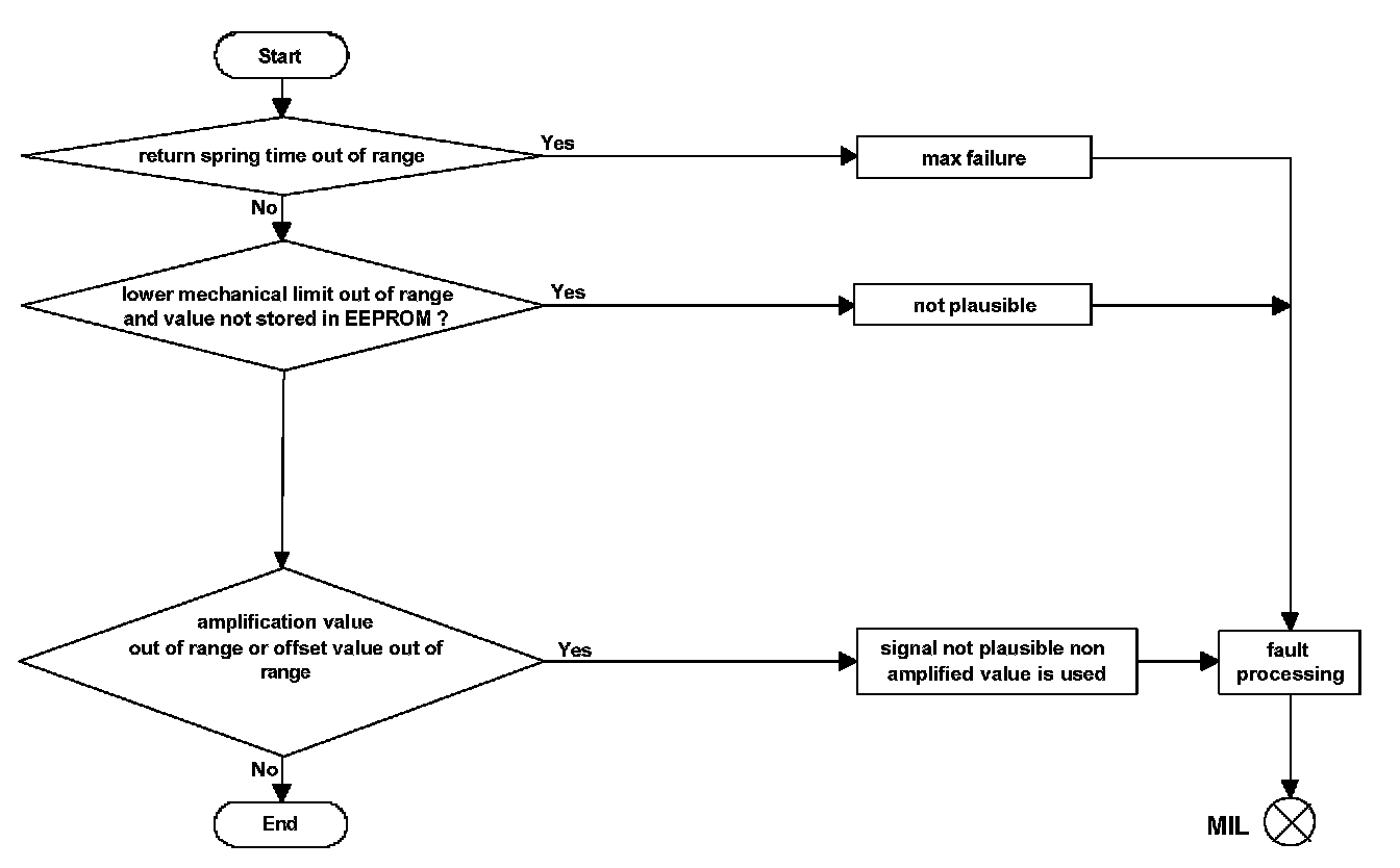 If the DLR output exceeds the upper or lower limit for a time longer than a given time an implausible duty cycle response / implausible actuator current fault is detected. The system is set to, "throttle valve drive default function" state. If DLR output surpasses the limits only for a shorter time the system requests safety fuel deactivation for a short period. This fault is reversible.