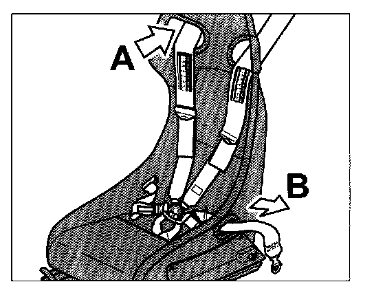 - Pull six-point seat belt through the upper openings in the backrest from behind -arrow A- and through the openings in the seat frame from the side -arrow B-.