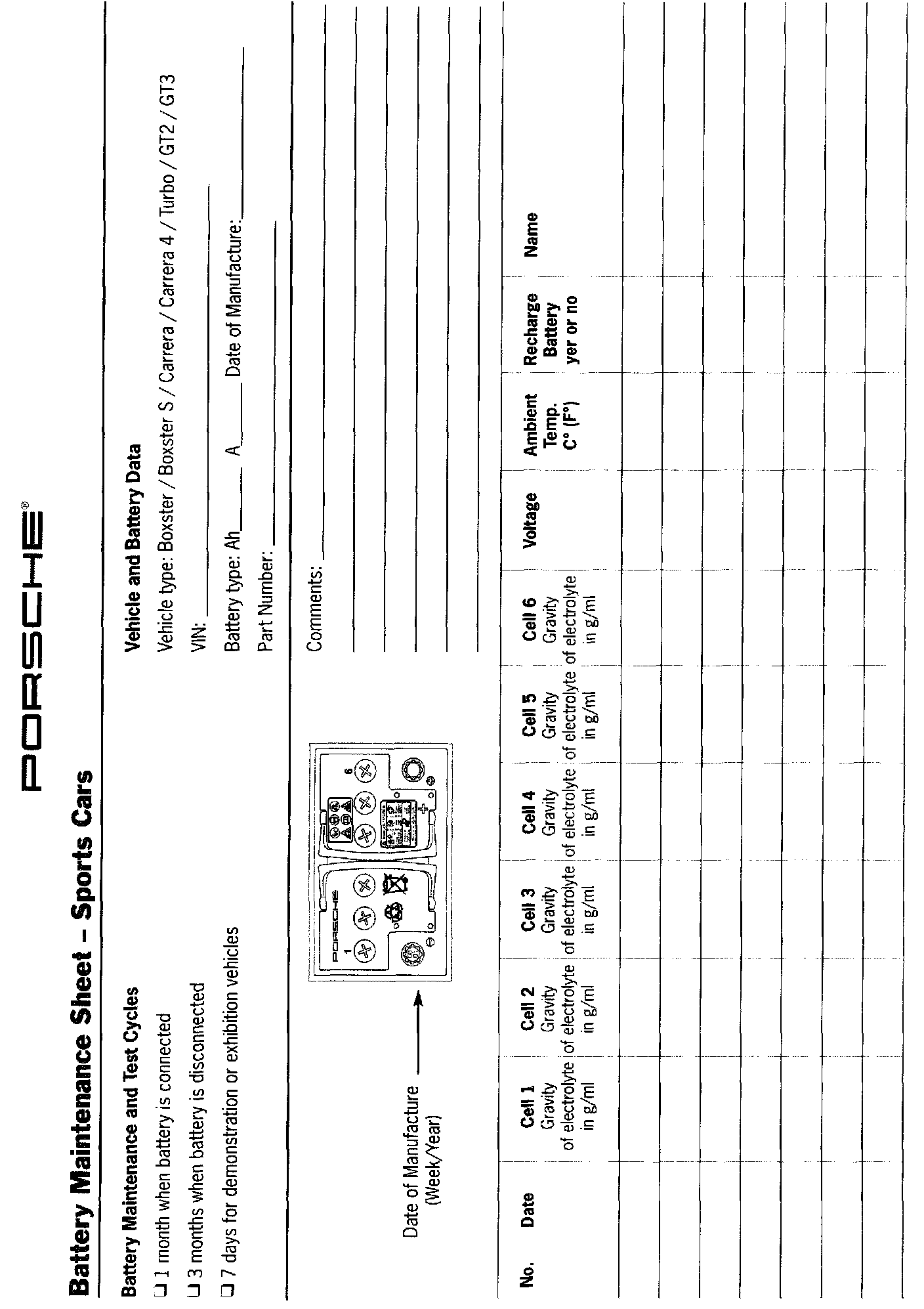 When a battery must be replaced, the Battery Maintenance Sheet must be completed and filed. In addition, if these maintenance instructions are not followed, we reserve the right to reject warranty claims. As part of the PSA (Porsche Service Analysis), these Battery Maintenance Sheets will be reviewed where necessary.