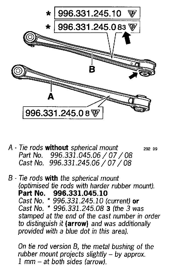 Only tie rods with harder rubber mounts (optimized tie rods with spherical mounts) version (B) - are still available from the Parts Service. Introduction of the optimized tie rods in the current model year 1999 (X) in some cases, but generally from model year 2000 (Y).