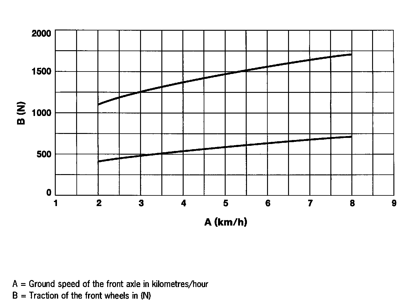Example: At 5 km/h ground speed, the traction of an intact viscous clutch must lie between approximately 600 N and 1450 N (refer to diagram).