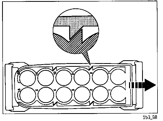 7. Unlock the secondary locking of the plug connection with a small screwdriver. Unlock both sides by inserting a small screwdriver and shift in the direction of the arrow. Figure shows secondary locking unlocked.