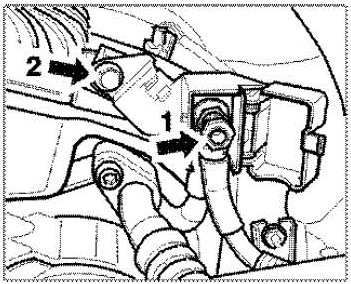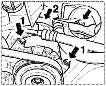 7. Lower the engine by 30 - 40 mm. To do this, support the engine with a jack and unscrew the two M12 collar nuts (a/f 18) of the rear engine mounts. Pay attention to hose and line connections.