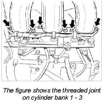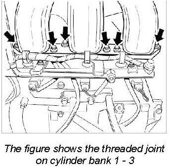 21. Remove intake distributor for cylinder bank 1 - 3 by unscrewing six M6 x 35 hexagon-head bolts. Use a small offset ring wrench (wrench size 10) for the front bolt. Remove intake distributor together with the front screw. Immediately plug or cover the intake manifold.