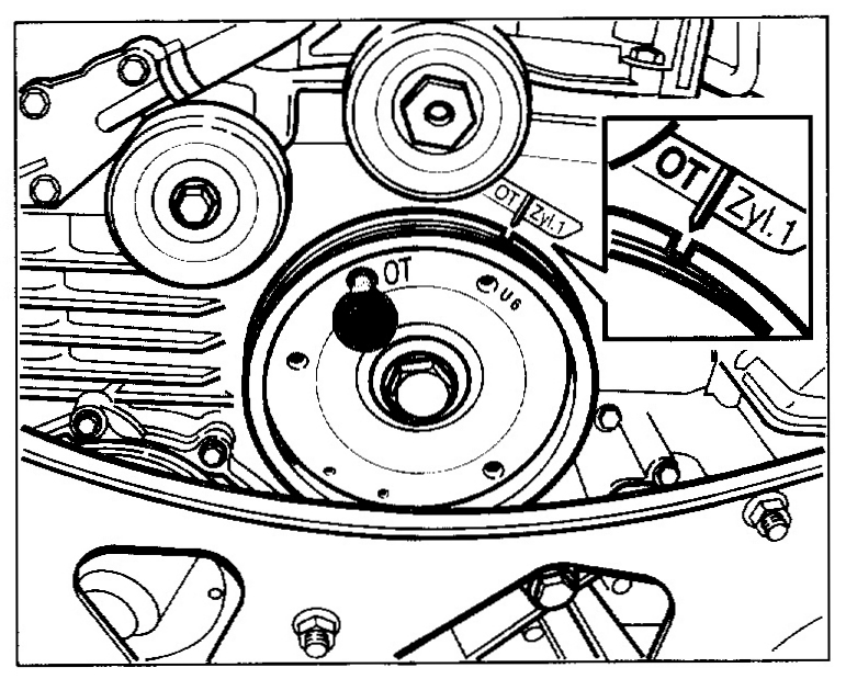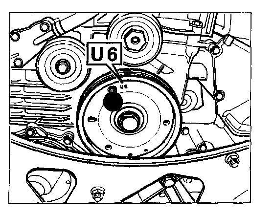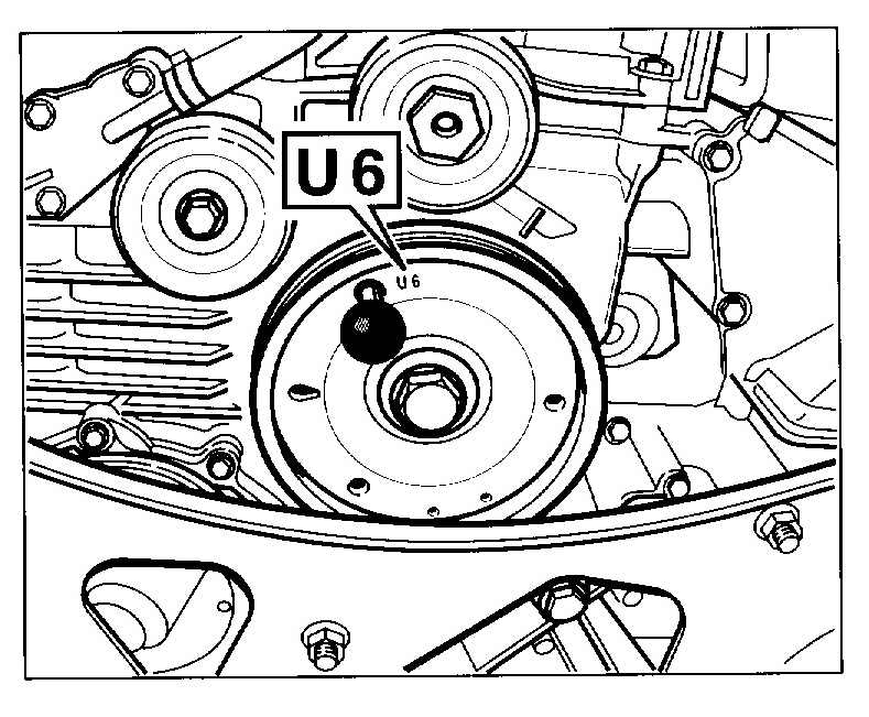 1. In order to remove the play from the control chain drive, turn the engine at the belt pulley of the crankshaft clockwise (engine direction of rotation) to 60 degree before TDC (identification U6 on the belt pulley is flush with the fixing bore in the crankcase). Fix with the special tool fixing pins as of mod. 98 No. 9595/1. Use short fixing pin.