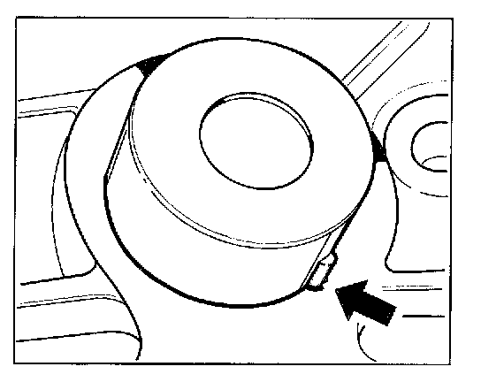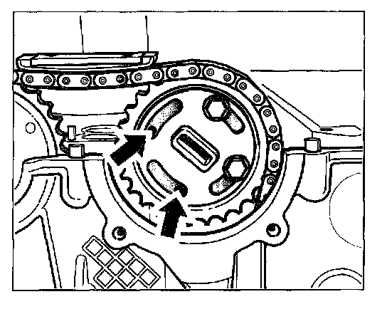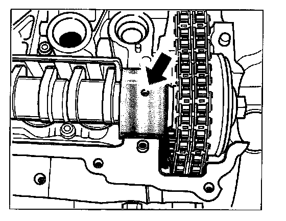 1. Align camshafts, On both camshafts, the smaller circular cut-outs must lie at the top -arrows-.