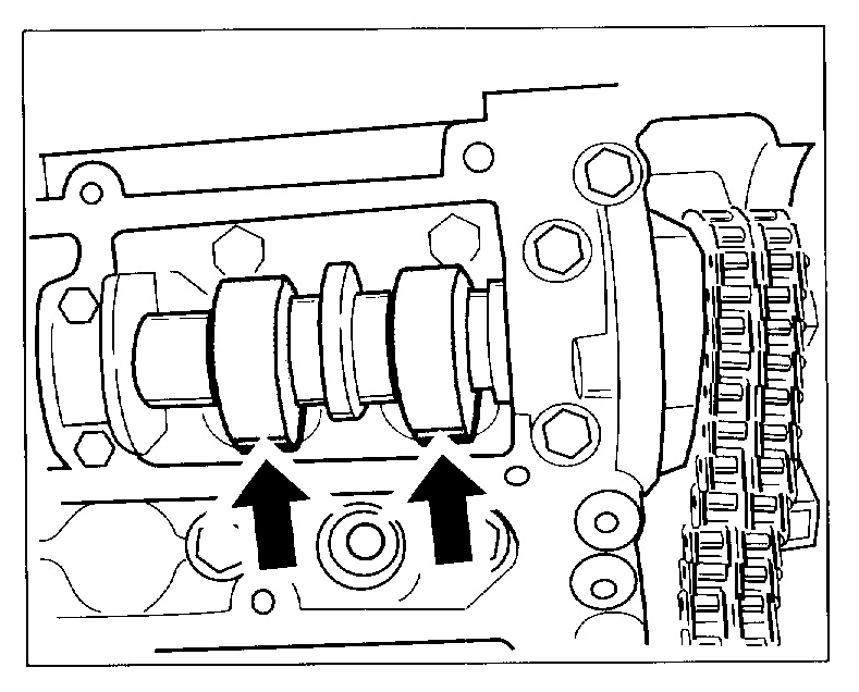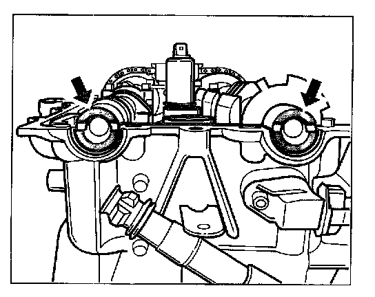 1. Align camshafts. On both camshafts, the smaller circular cutouts must lie at the top -arrows-. If necessary, shift the camshafts slightly.