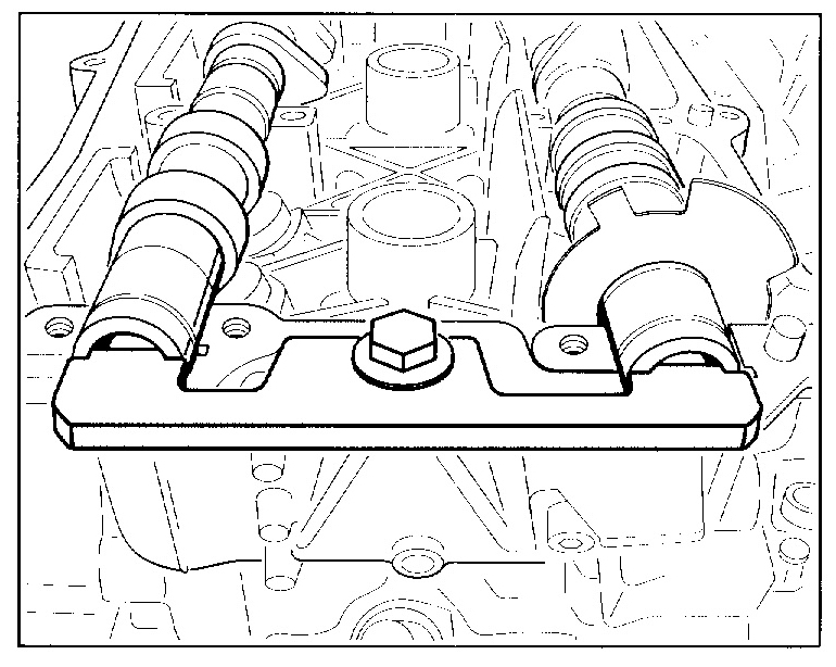2. Fix the camshafts with special tool adjustment gauge No. 9686 and fasten the gauge with one M8 auxiliary screw (e.g. M8 x 16 hexagon-head bolt) (flat tool surface should face upwards). Only tighten the screw slightly.