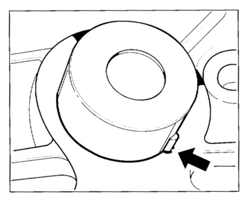 6. Turn the engine at the belt pulley of the crankshaft clockwise (engine direction of rotation) to the TDC marking (the TDC bore in the belt pulley is flush with the fixing bore in the crankcase). Fix with the special tool fixing pins as of mod. 98 No. 9595/1. Use short fixing pin.