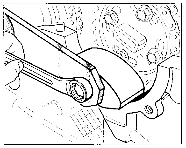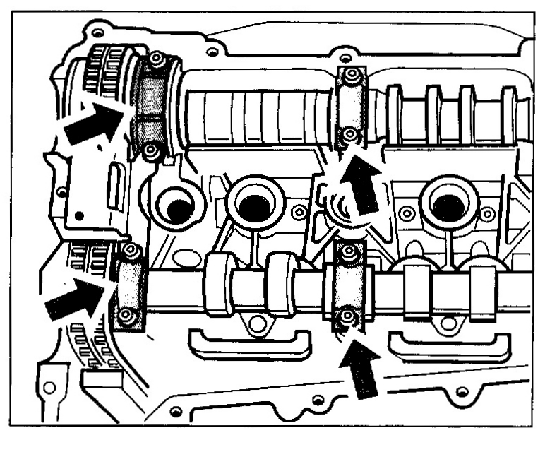 3. Screw the bearing cover screws of the inlet and exhaust camshafts and the auxiliary screw of the adjustment gauge alternately by another approx, 90 degree until the specified tightening torque of 10 Nm (7.5 ftlb.) is reached.