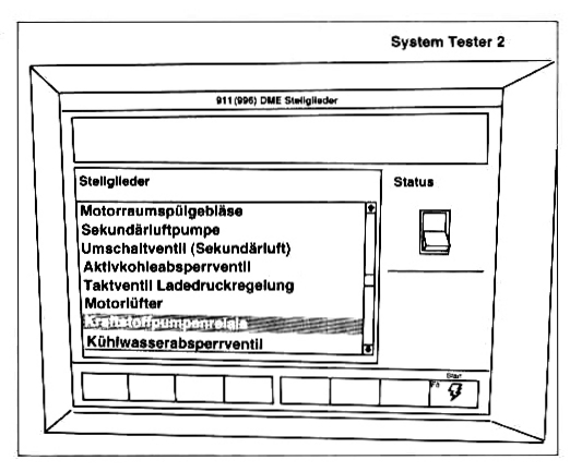 8. Actuate the fuel-pump relay with the Porsche System Tester PST 2. To do this, select the line "Drive links" after Control units - DME individual search, then select the fuel-pump relay and activate it using the "F8" key -see Figure- until fuel emerges from the drainage hose. Deactivate the fuel-pump relay using the "F8" key and drain any escaping fuel from the container into a petrol-resistant container. Have a stopwatch ready for subsequent measurement.