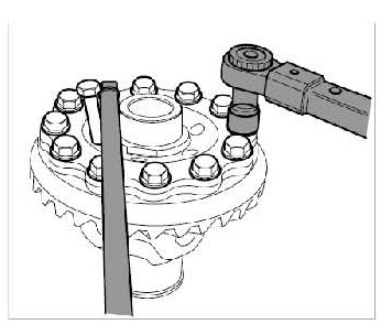 1. Position crown wheel on differential housing and screw in screws in diagonally opposite sequence until