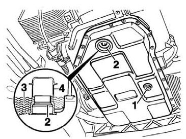 - The stipulated fluid level (3) is extremely important to perfect functioning of the automatic transmission. It is correct if there is still a slight amount of ATF escaping at the filler screw (2) hole at temperatures between 30 C and 40 C.