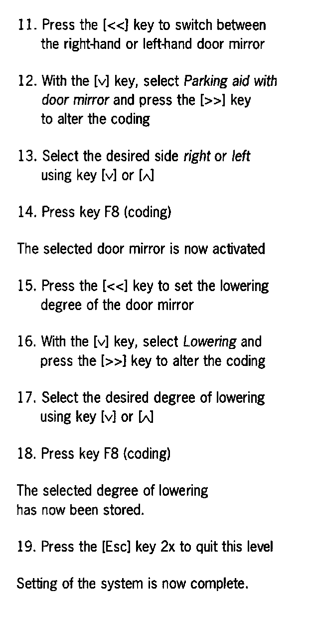 - Parking aid with door mirror (right or left)