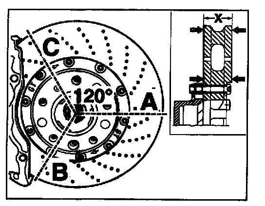 - Measure the brake disc thickness -X- in the area of the outer 'or' inner friction surface traces -arrows-, at 3 measuring points (each offset by 120 degree) -A/B/C-. To do this, use a suitable micrometer screw or a brake disc gauge (drawing shows a GT2 brake disc).