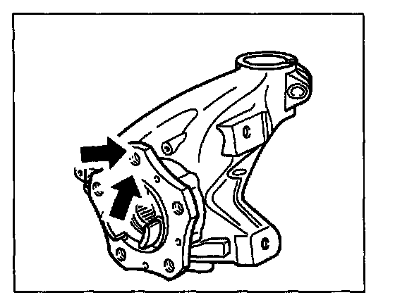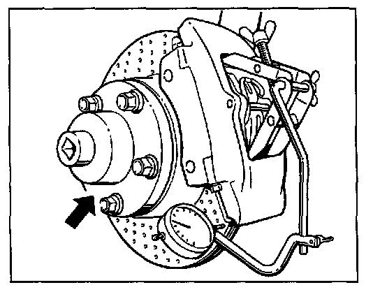 - Check the wheel hub lateral runout as described below: Measure 1 x outside -arrow- and 1 x inside -arrow- of the wheel bolt area (5-point measuring procedure) on the front face of the wheel hub. Fasten the dial gauge using a commercially available universal dial gauge holder (refer to Workshop Equipment).