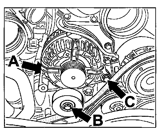 10. Remove generator. To do this, unscrew and remove the left generator fastening screw -A- (a/f 15) in the direction of travel. Subsequently remove the deflection roller (a/f 15) -B- under the generator. Unscrew the right generator fastening screw -C- (a/f 15) approx. 10 mm and subsequently drive in the screw head with a hammer and aluminium mandrel until it is flush. This loosens the front threaded bushing in the generator swivel arm. Remove fastening screw. Remove generator from the bracket.