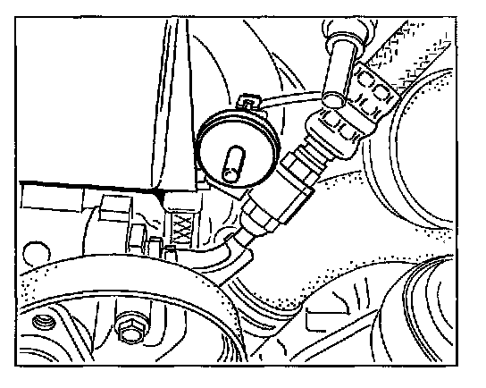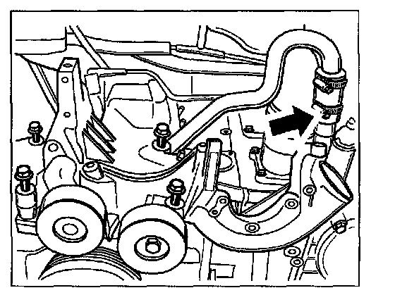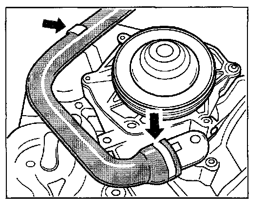 10. Coat the coolant hose with water and fasten to the flange of the coolant pump. Engage coolant hose to the upper holder.