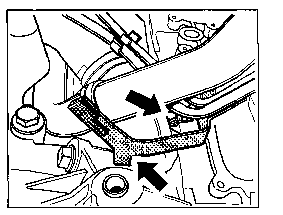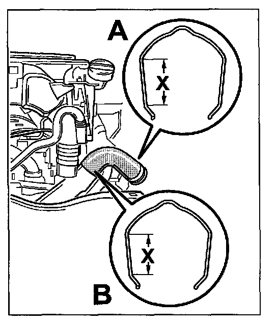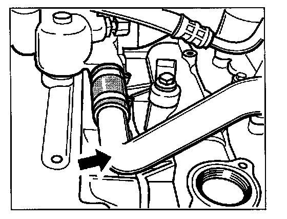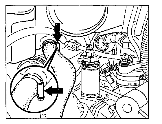 6. Two different locking clips are fitted on the right coolant hose. The locking clips must not be confused.