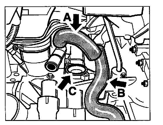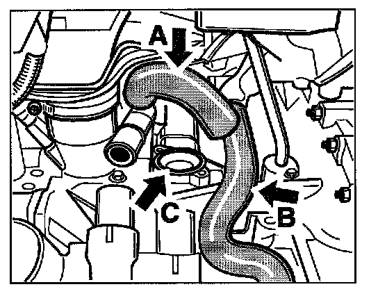 28. Undo coolant hose -A- and coolant hose -B- and pull off. Remove and dispose of sealing ring -C-.