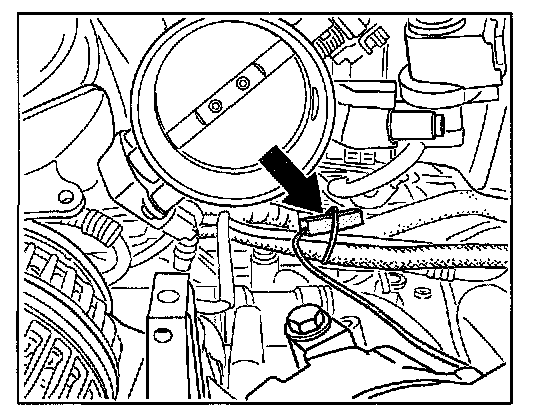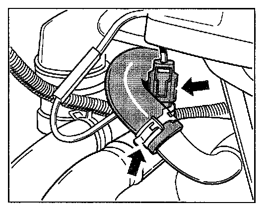 5. Pull off electrical wire connector of the hot film mass air flow meter. To do this, push the plug on the grooved surface at the sides and pull the plug off in an upward direction. Open the omega clip on the right side of the air cleaner housing and take out the electrical wire of the hot film mass air flow meter. Reclose the omega clip for the removal (risk of breakage).