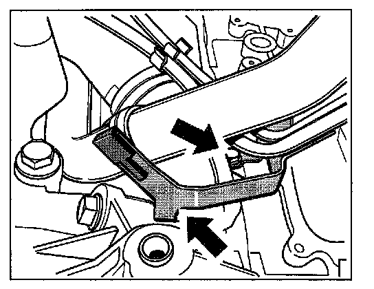 - Raise the vehicle at the engine by means of a workshop jack so that the swivel arms of the hoist passes underneath the kick plates without damage.