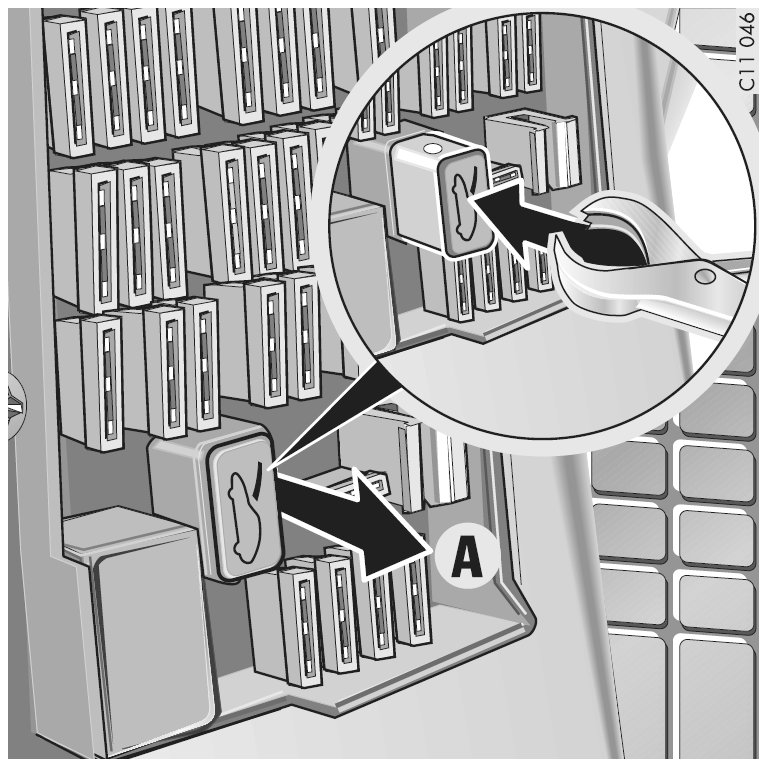 2. Remove cover on the fuse box and pull emergency power contact (A) out of the fuse box.