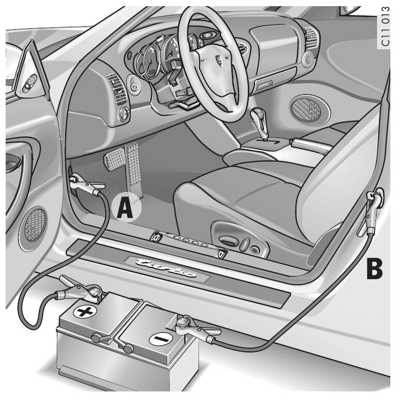 - In the event of a flat battery, the release engines of both covers can be supplied with electricity, via a battery jump lead.