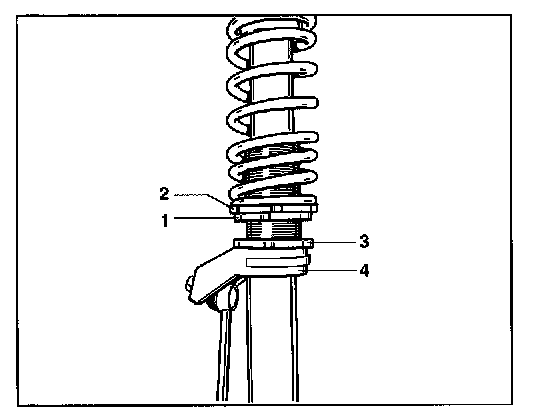 The front and rear axle spring strut has a thread and a height adjusting nut -2- for height adjustment. The height adjusting nut -2- is secured against turning by the lock nut -1-. The stabilizer block (mounting saddle for the stabilizer mount) -4- is also fitted on the thread. The stabilizer block can be vertically adjusted and it is provided with a lock nut -3-. This adjustment possibility is only useful for racing. It can be used to ensure that enough clearance is available for the stabilizer mount even for deviating vehicle heights (only for racing) and also that the stabilizer mount can be fitted free of tension. The stabilizer block -4- does not need to be adjusted for the vehicle height prescribed for street use. The stabilizer block is also adjusted for replacement dampers.