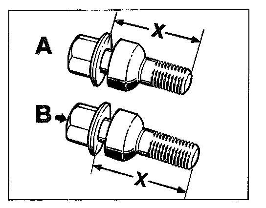B - GT3 wheel bolt up to model year 2003. Dimension X approx. 50 mm. Designation with GT or red colour (arrow)