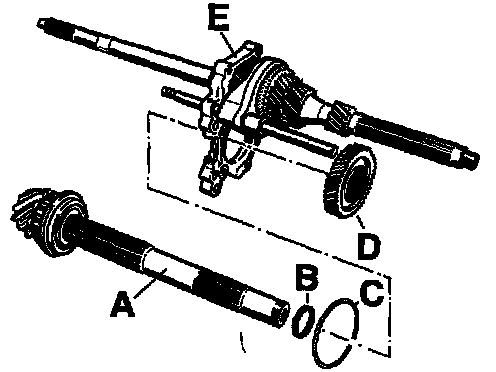 7. Insert output shaft -A- with adjusting shim S5 -B- and adjusting shim S4 -C- into tensioning plate -E-.