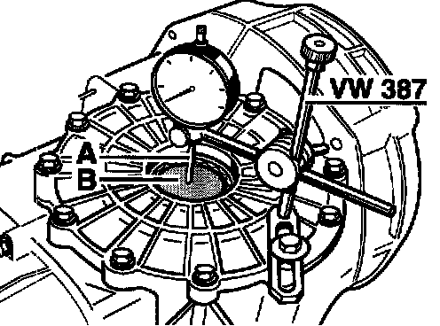 4. Measure the play at the four-point bearing. To do so, fit the dial gauge with the special tool dial gauge holder VW 387. Press the outer bearing race forwards as far as possible and set the dial gauge to 0.