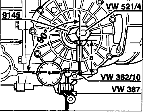 9. Mount the special tool dial gauge holder VW 387 with the dial gauge in such a way that a right angle is formed between the dial gauge axis and the special tool gauge plunger VW 388.