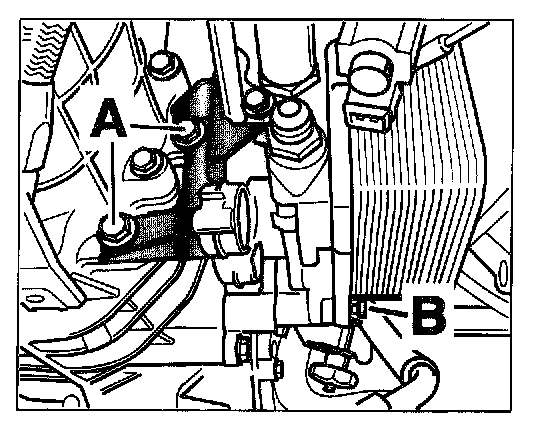 11. Unscrew the holder screws -A- and the hexagon socket head bolt -B- and pull out the transmission oil cooler with the bracket.