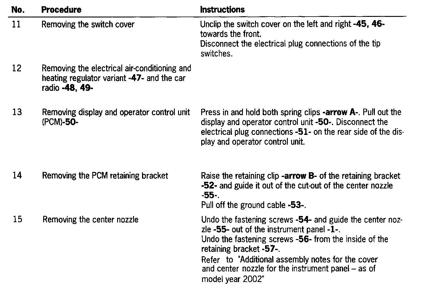 - The following components; screen, center nozzle and holder have changed on the instrument panel for model year 2002 (model care). The instrument panel has a glove compartment and a cupholder. The procedures described in the following are to be carried out for repair work on the components (model year 2002).