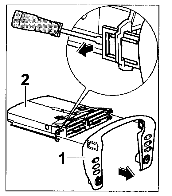 Push in locking tab on the cover -1- using a screwdriver. Pull out center nozzle -2-.