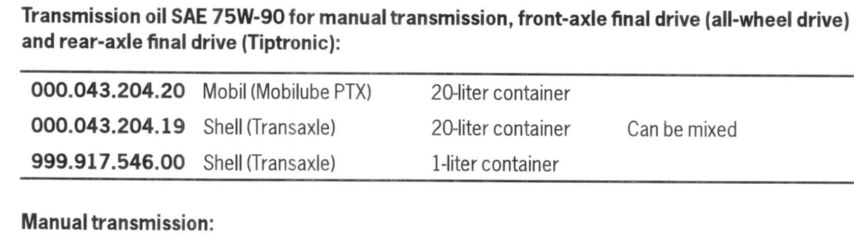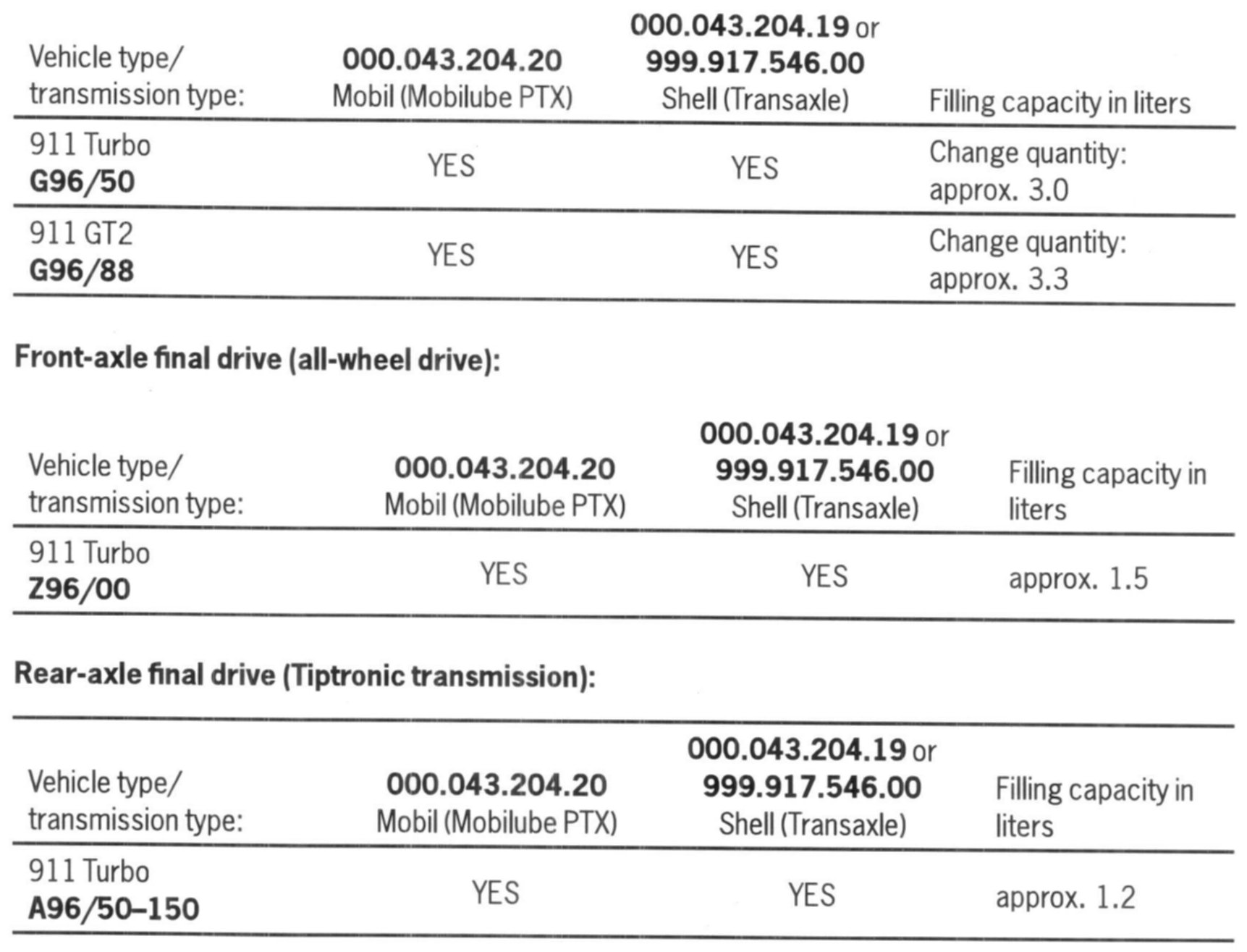 As there are special requirements for the manual and Tiptronic transmission as well as the rear-axle and front-axle final drive of the 911 Turbo (996) and 911 GT2 (996), only the ATF and transmission oil types tested by Porsche are approved.