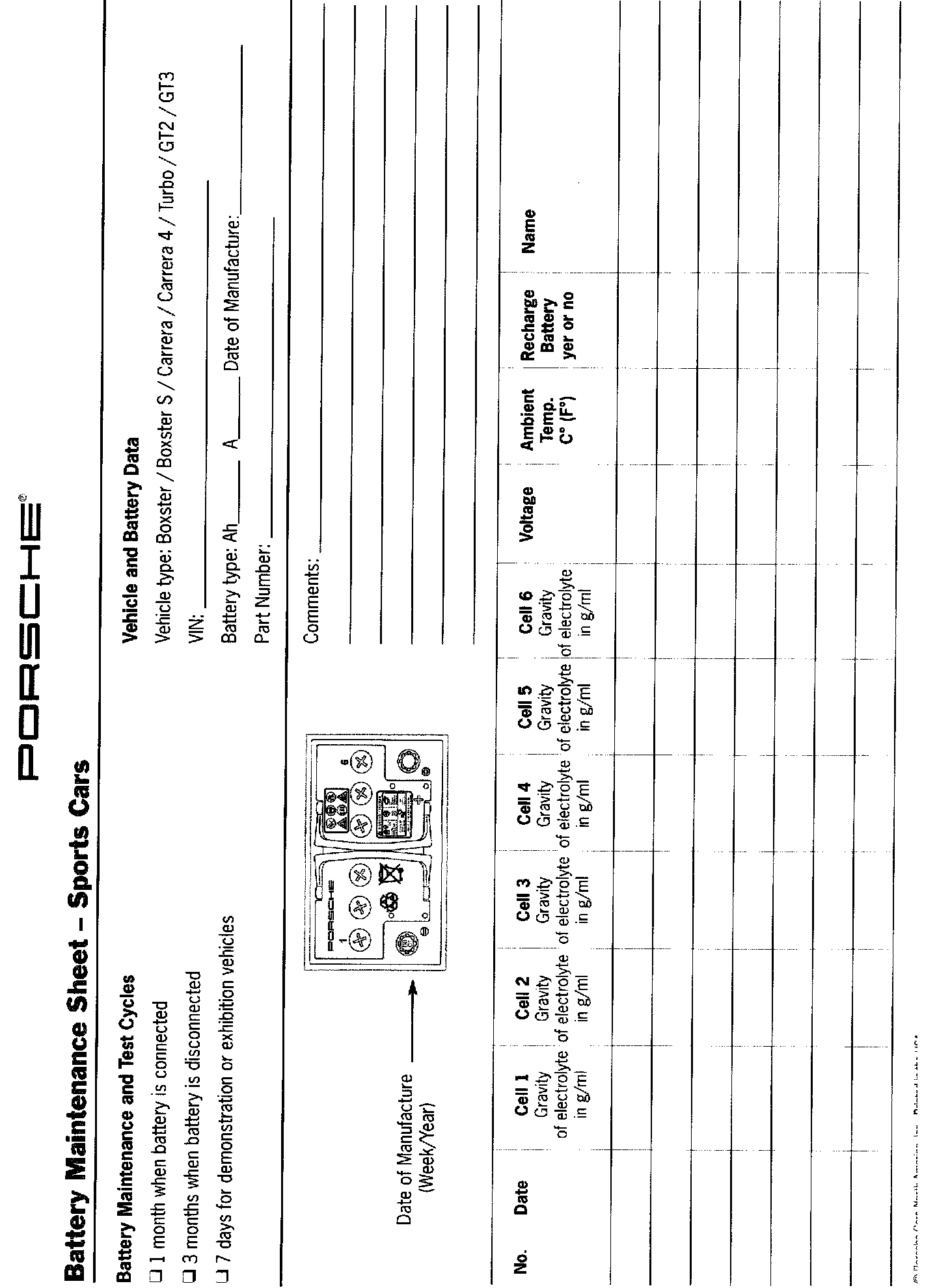 When a battery must be replaced, the Battery Maintenance Sheet must be completed and filed. In addition, if these maintenance instructions are not followed, we reserve the right to reject warranty claims. As part of the PSA (Porsche Service Analysis), these Battery Maintenance Sheets will be reviewed where necessary.