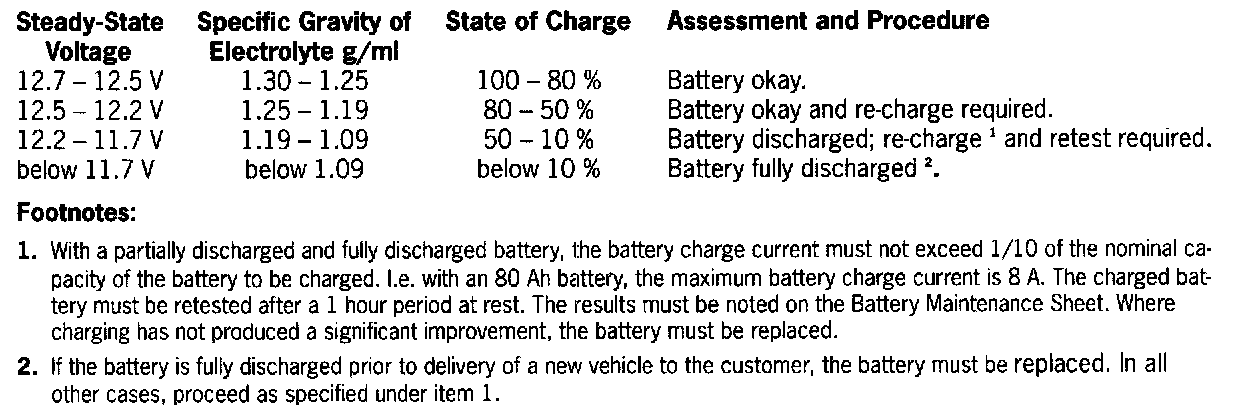 To ensure good measuring as well as charging results, the minimum temperature of the battery must be 10 °C (50°F). Where the ambient temperature is below 10 °C (50°F), the battery or the vehicle must be placed in the workshop/heated room for at least 12 hours. This will ensure a uniform temperature within the battery. The measuring values for the gravity of electrolyte of the individual battery cells should not deviate by more than 0.03 g/ml from each other. If this is the case, the battery must be charged and subsequently retested. The results must be noted on the Battery Maintenance Sheet.