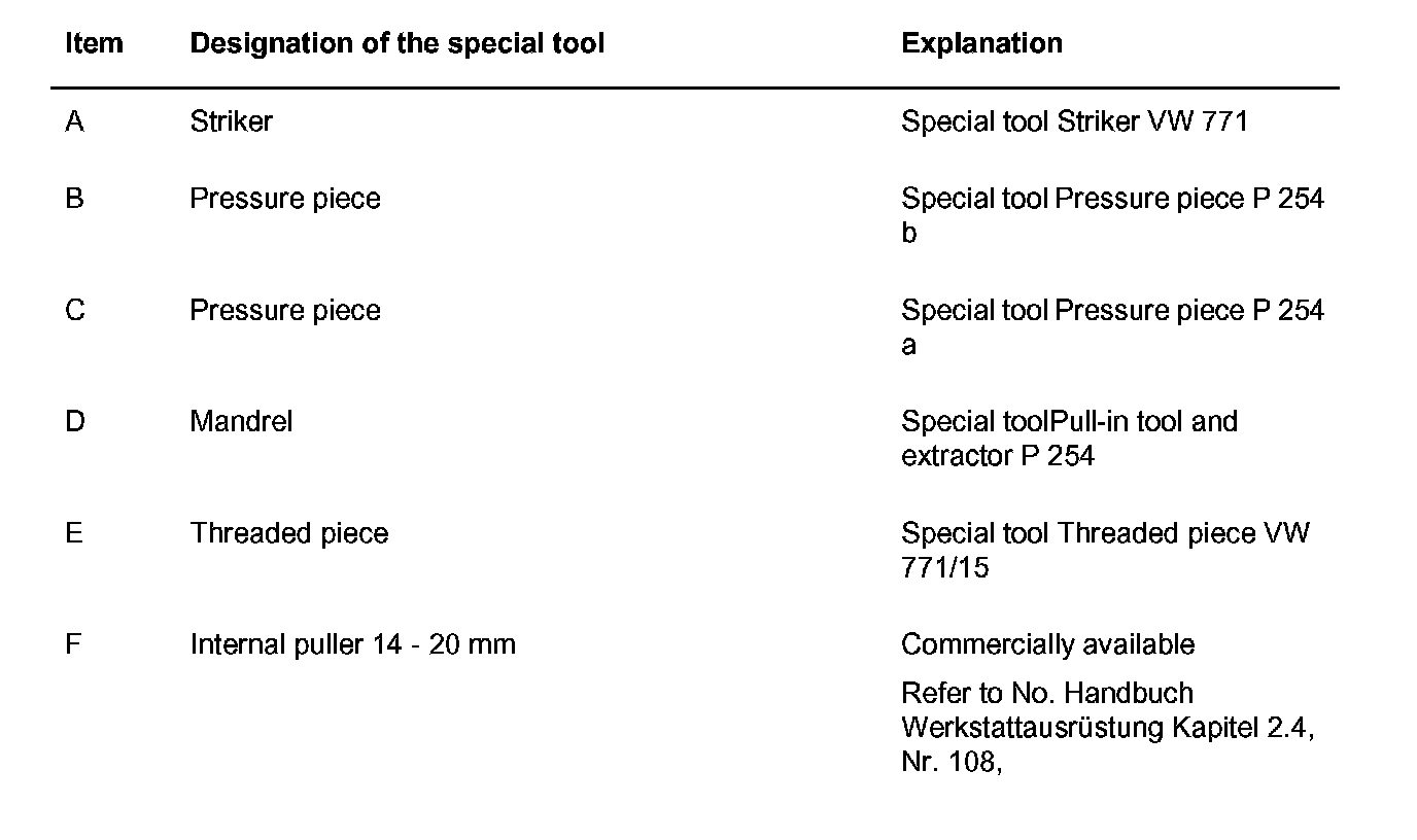 1. Knock out ball sleeve (no. 8 to 11 in overview) outwards with internal puller 14 - 20 mm and special tool striker VW 771.