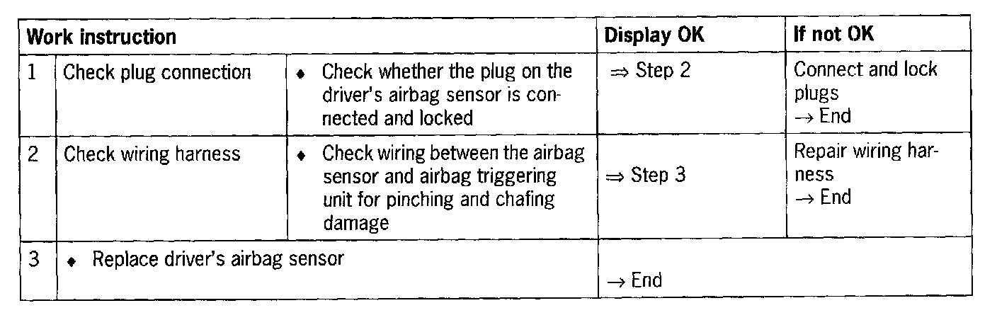- Short circuit to B+/ground or open circuit in the wiring between the driver's airbag sensor and the airbag triggering unit