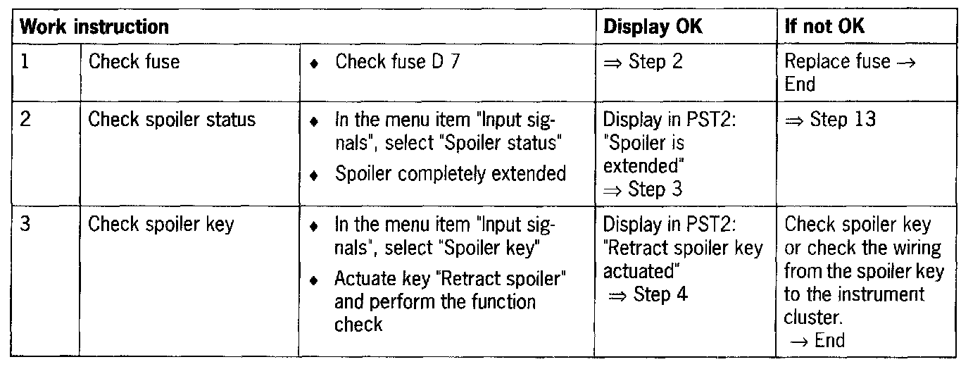 - The instrument cluster expects the checkback concerning the new status of the spoiler after the speed exceeds or falls below the limit and after relevant activation. If a change in status is not registered despite the control, the fault code 9150 is stored and the warning text "Failure of spoiler control" is emitted on the display.