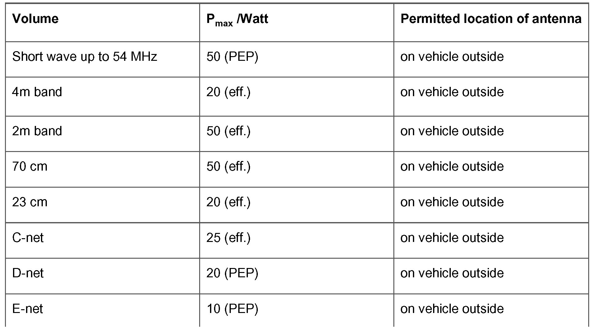 - The transmission powers in the given frequency range may not exceed the respective Pmax values at the antenna base.