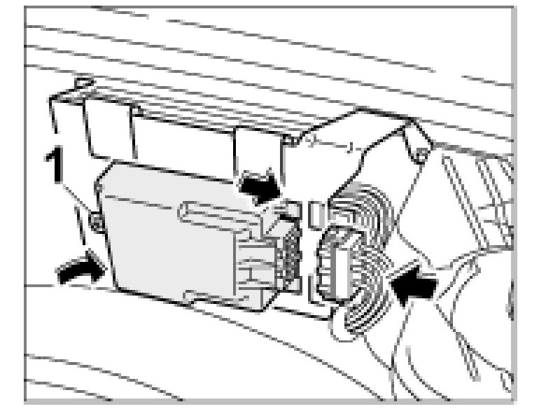1. Open the luggage-compartment lid and if present, detach the additional amplifier on the clip -1- and detach the additional amplifier (in the direction of travel) to the right.